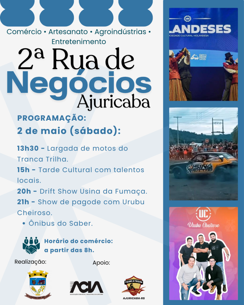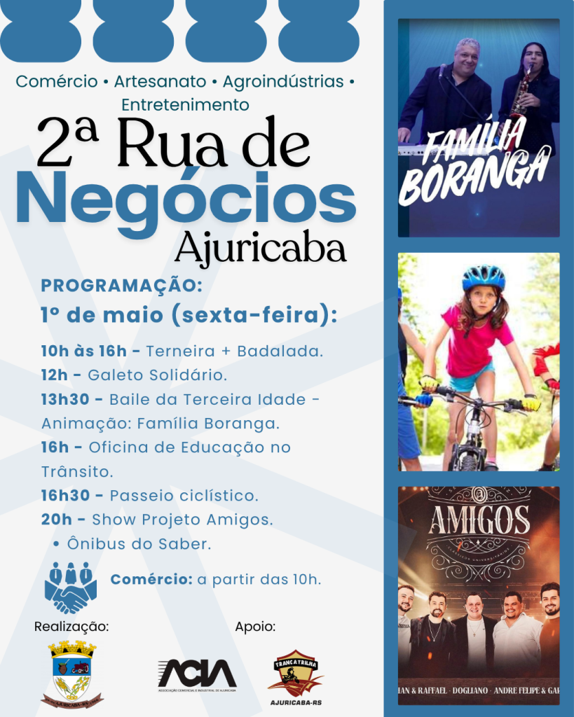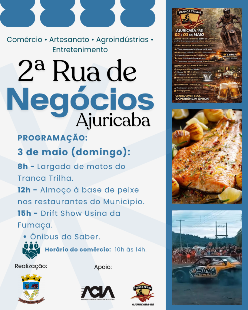 A Administração Municipal, com o apoio da ACI e do Tranca Trilha, finaliza os últimos preparativos para a 2ª edição da Rua de Negócios, que será realizada de 30 de abril a 3 de maio, na Praça Notélio Mariotti e ruas Oscar Schmidt, Henrique Schmadecke, Pedro Paiva Machado e Matriz.