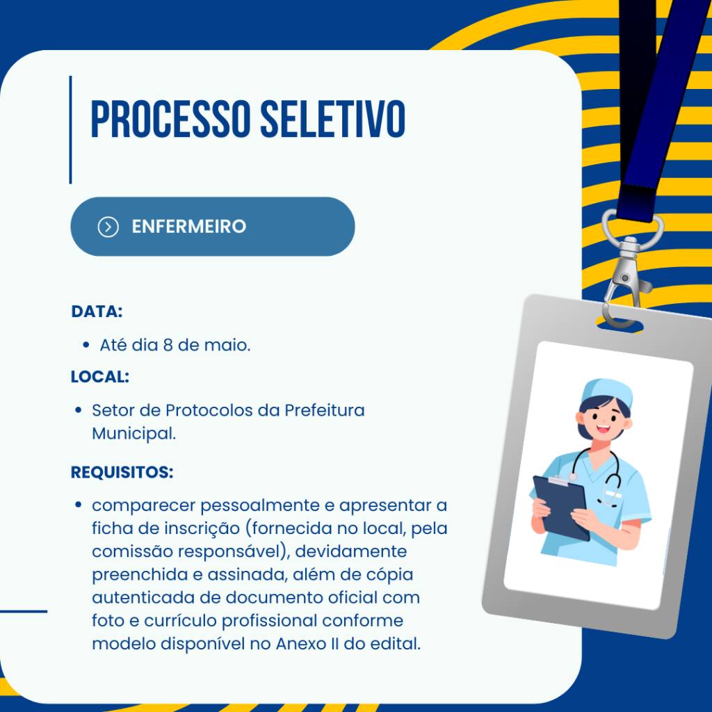 Estão abertas, até o dia 8 de maio, as inscrições para o Processo Seletivo Simplificado destinado à contratação temporária de profissional para a função de enfermeiro, visando atender necessidade excepcional de interesse público no município de Ajuricaba.