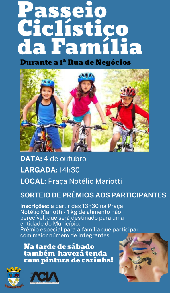 No sábado, dia 4 de outubro, às 14h30, acontece o Passeio Ciclístico da Família, com inscrições mediante doação de 1 kg de alimento não perecível que serão destinados a uma entidade do município. O comércio funcionará até as 16h e haverá sorteio de prêmios aos participantes.