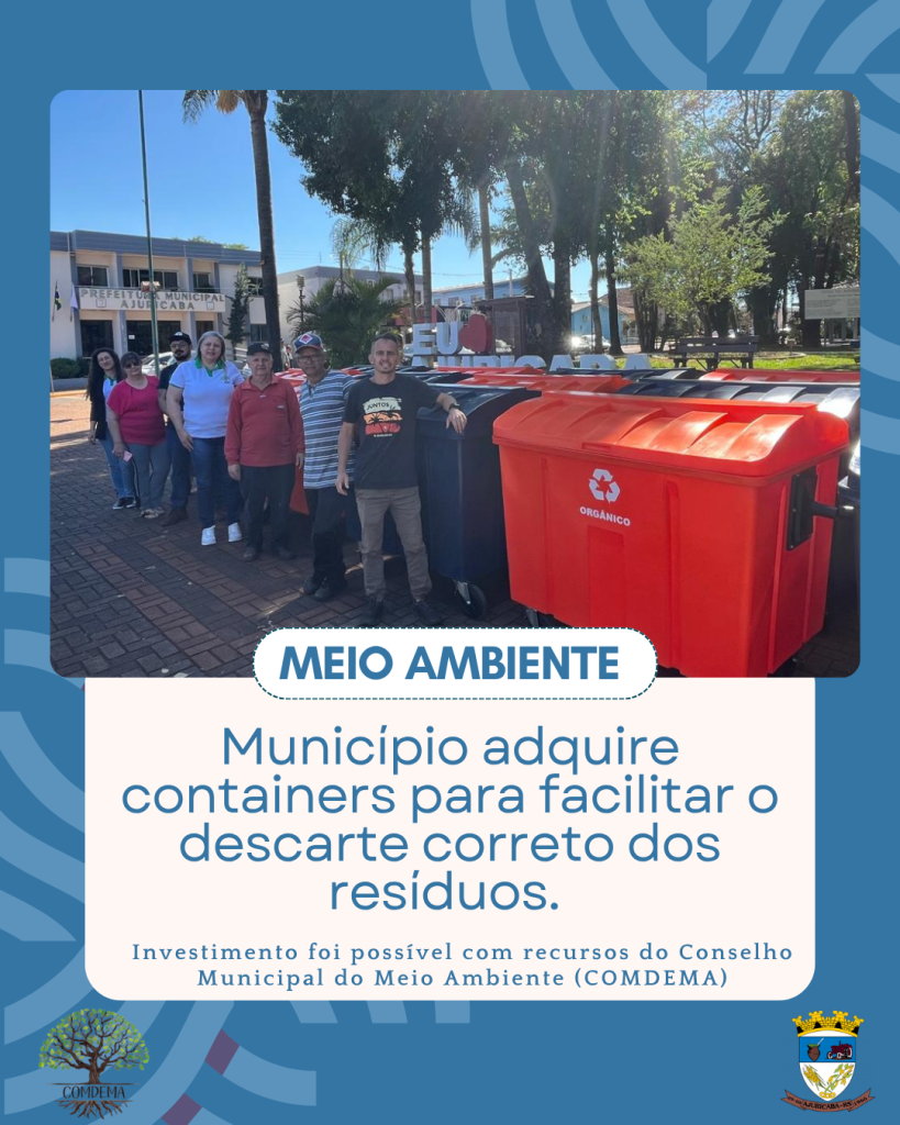 Na manhã desta quarta-feira, o Município de Ajuricaba recebeu 30 novos containers destinados à melhoria da gestão dos resíduos sólidos urbanos. O investimento, de R$ 30.840,00, foi realizado com recursos do Conselho Municipal do Meio Ambiente (COMDEMA), reforçando o compromisso da administração com práticas sustentáveis e com o cuidado ambiental.