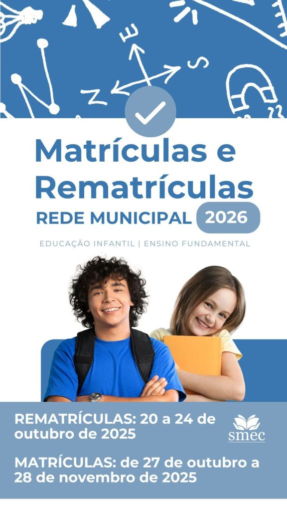 A Secretaria Municipal de Educação informa que o período de rematrículas para os alunos das Escolas Municipais de Educação Infantil e Ensino Fundamental ocorrerá de 20 a 24 de outubro de 2025. Já o período destinado às novas matrículas será de 27 de outubro a 28 de novembro de 2025.