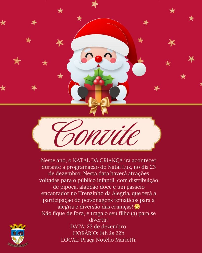 Neste ano, o tradicional Natal da Criança será realizado de uma forma especial e inovadora. A atividade será integrada à programação do Natal Luz de Ajuricaba, acontecendo no dia 23 de dezembro, na Praça Notélio Mariotti, em um momento pensado para as famílias e, em especial, para o público infantil.