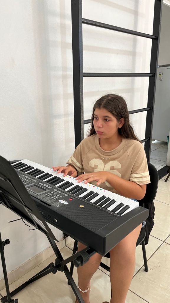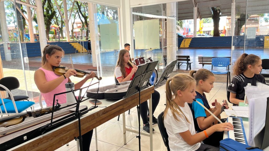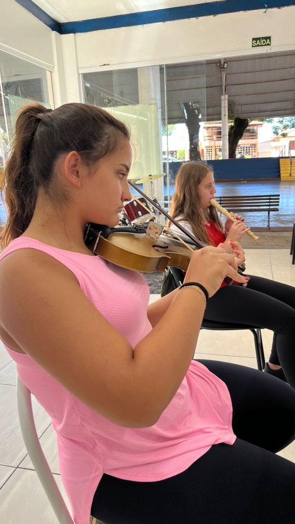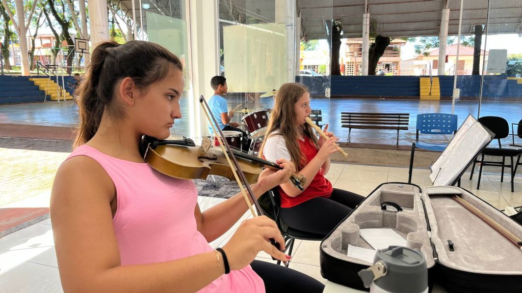 O projeto oferece aulas de violino, violão, escaleta, flauta, bateria, teclado, saxofone, contemplando uma variedade de instrumentos que permitem aos alunos explorar diferentes sons e estilos musicais.