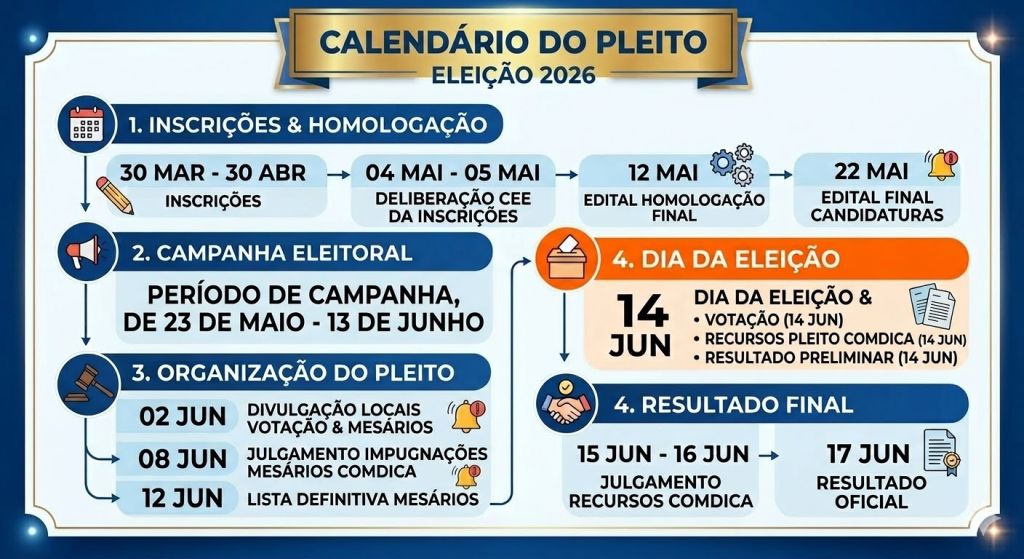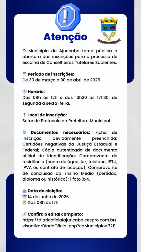 A eleição dos candidatos está prevista para o dia 14 de julho de 2026, das 08h às 17h, oportunizando à comunidade ajuricabense participar ativamente da escolha dos representantes que atuarão na garantia dos direitos das crianças e adolescentes.