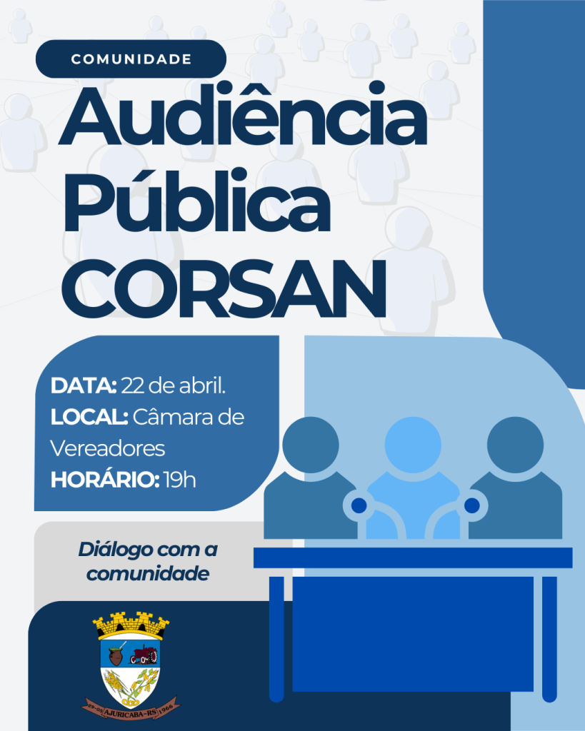 A Administração de Ajuricaba promoverá, no dia 22 de abril, às 19 horas, uma audiência pública na Câmara de Vereadores, com a presença de representantes da Corsan, para tratar de temas de grande relevância para a comunidade.