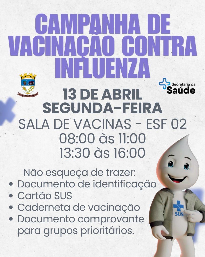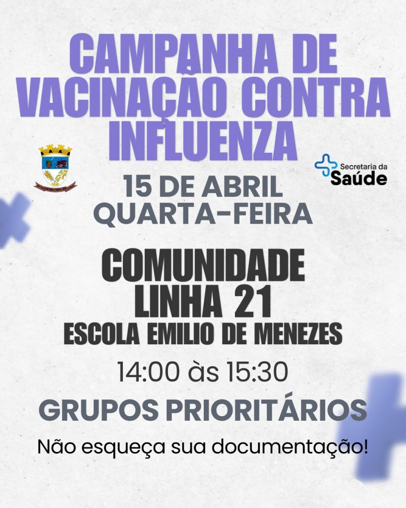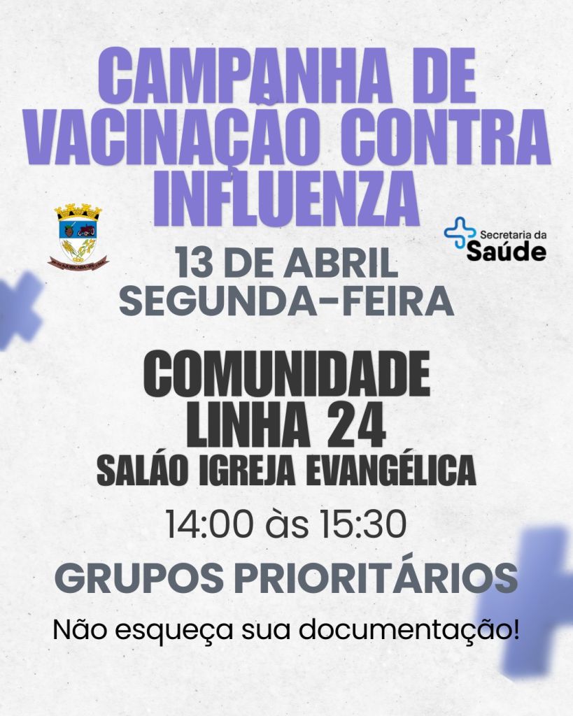 A Secretaria de Saúde informa que terá continuidade na próxima semana a vacinação contra Influenza. Na segunda-feira, dia 13 de abril, a vacinação seguirá normalmente junto à Sala de Vacinas, das 8h às 11h e das 13h30 às 16h. Além disso, no mesmo dia, uma equipe da saúde também estará atendendo na comunidade da Linha 24, das 14h às 15h30, no Salão da Igreja Evangélica, levando a campanha de imunização até a comunidade.