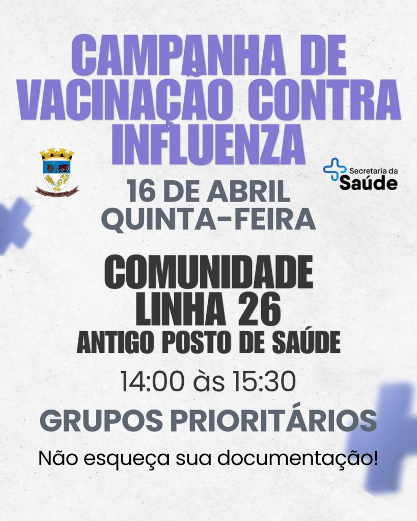 Já na quinta-feira, dia 16 de abril, a imunização será realizada na Comunidade da Linha 26, no antigo Posto de Saúde, também no horário das 14h às 15h30.
