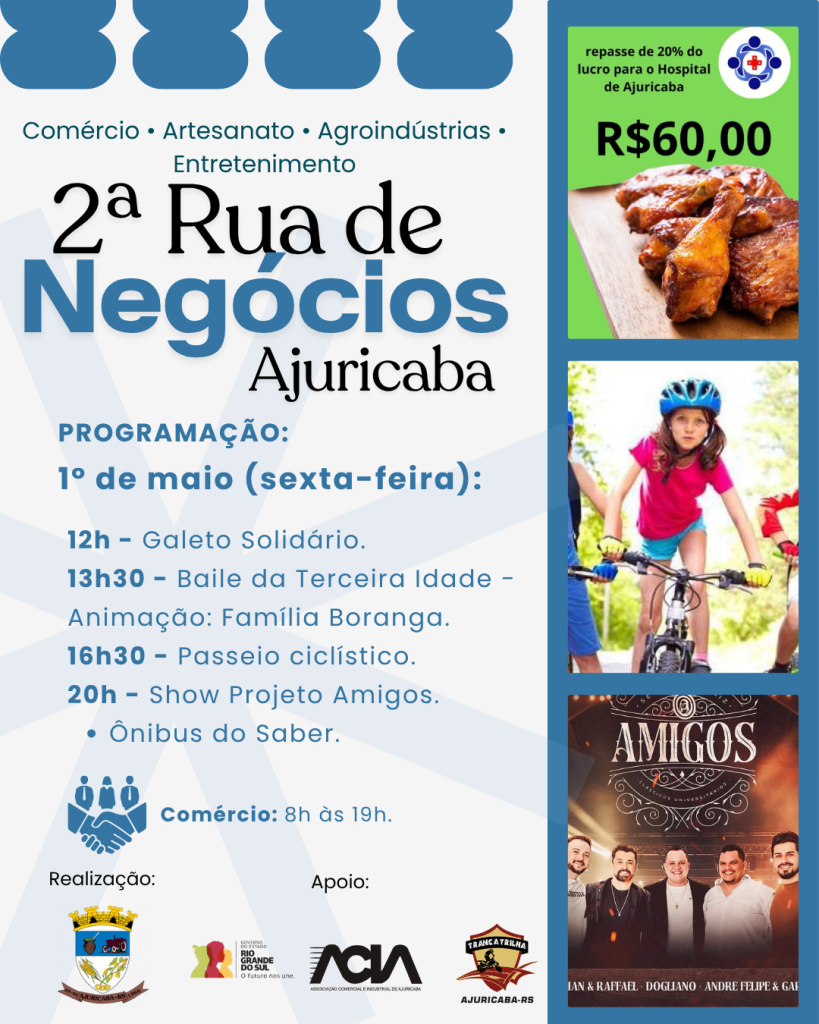 No dia 1º de maio, além do Baile da Terceira Idade, haverá o Galeto Solidário, passeio ciclístico e, à noite, a partir das 20h, show com o Projeto Amigos.