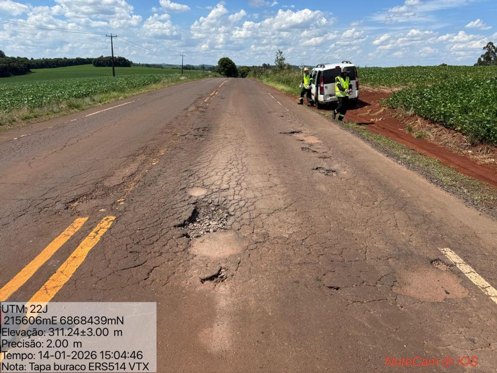 Após diversas solicitações encaminhadas pela Administração Municipal às equipes do Departamento Autônomo de Estradas de Rodagem (DAER), foi iniciada nesta semana a operação tapa-buracos na ERS-514, no trecho que liga Ajuricaba à localidade de Chorão. A expectativa, após diálogo com o Daer, é de que a manutenção seja realizada em todo o trajeto.