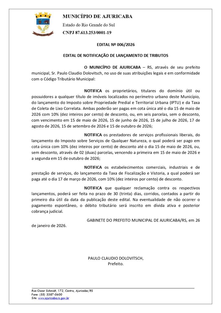 A Prefeitura de Ajuricaba publicou o edital de notificação de lançamento de tributos municipais referentes ao exercício de 2026, conforme o Código Tributário Municipal.