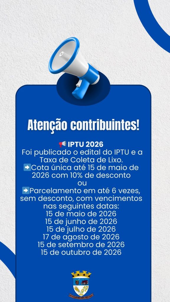 Os proprietários de imóveis localizados no perímetro urbano devem ficar atentos ao IPTU e à Taxa de Coleta de Lixo, que poderão ser pagos em cota única até o dia 15 de maio de 2026, com 10% de desconto, ou parcelados em até seis vezes, sem desconto, com vencimentos entre maio e outubro.