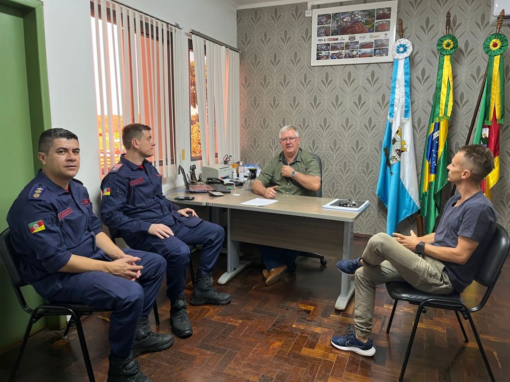 O prefeito Paulo Dolovitsch, acompanhado do coordenador municipal da Defesa Civil, Jeferson Niedvetzki, recebeu na manhã desta terça-feira a visita do comandante do 12º Batalhão de Bombeiro Militar, Tenente-Coronel Elisandro Machado, e do 1º Tenente Agnoletto, do Corpo de Bombeiros de Ijuí.