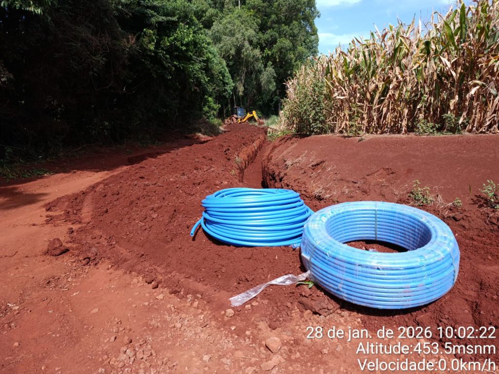 Para viabilizar as melhorias, foram adquiridas mangueiras com recursos da Defesa Civil, possibilitando, até o momento, a execução de aproximadamente 3.200 metros de novas ligações de água, beneficiando produtores que até então não contavam com abastecimento encanado, bem como com aqueles que enfrentavam dificuldades devido à antiguidade das ligações existentes na rede.