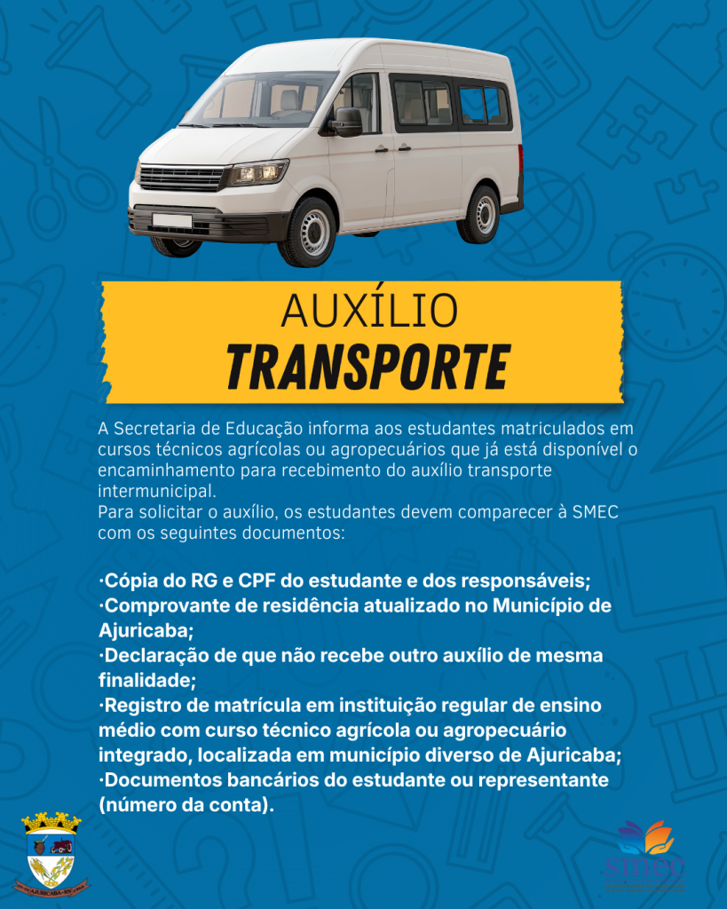 A Secretaria de Educação informa aos estudantes matriculados em cursos técnicos agrícolas ou agropecuários que já está disponível o encaminhamento para recebimento do auxílio transporte intermunicipal. Os alunos interessados devem comparecer à SMEC para realizar o cadastro e dar entrada no benefício.