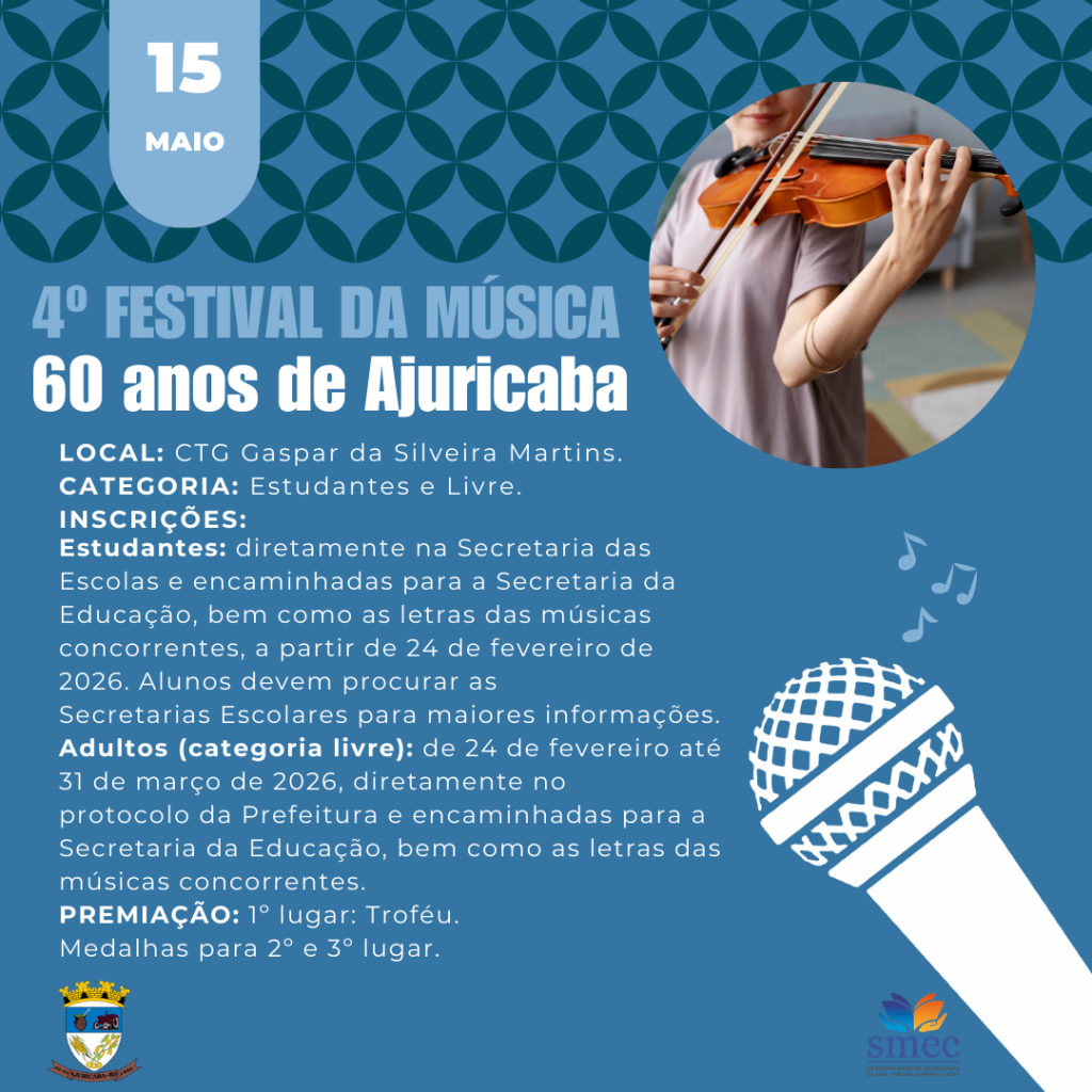 A Secretaria Municipal de Educação, Cultura, Turismo, Desporto e Lazer, promove o 4º Festival da Música, que neste ano integra a programação comemorativa dos 60 anos de emancipação do Município. A iniciativa valoriza a música como ferramenta de educação, cultura e inclusão, estimulando o desenvolvimento da percepção auditiva, da sensibilidade, do ritmo e da expressão artística de crianças, jovens e adultos.