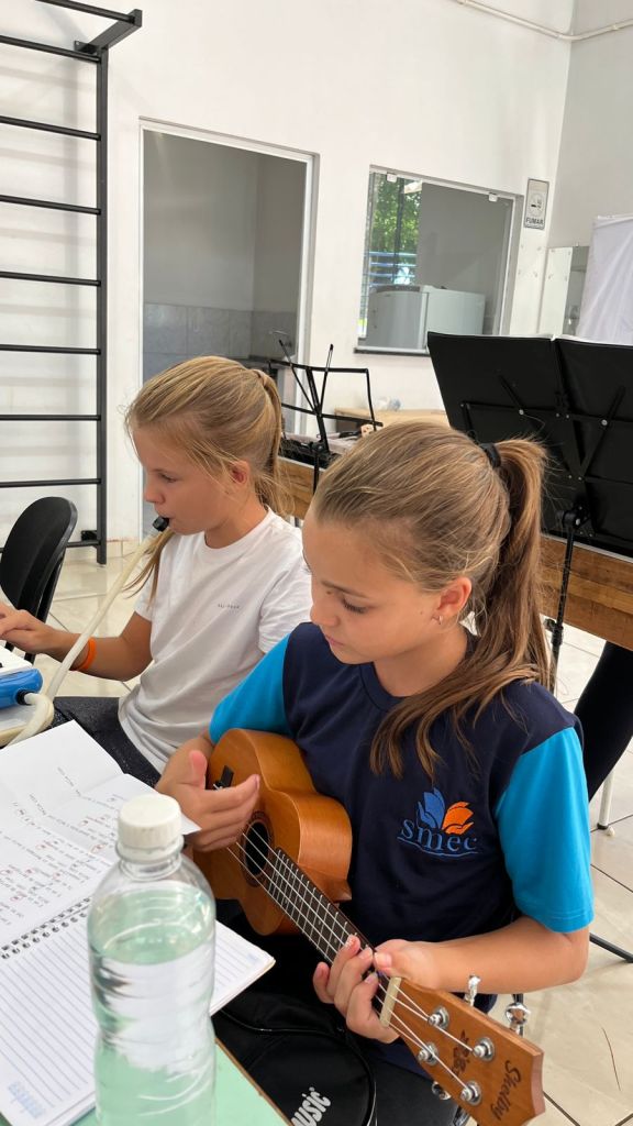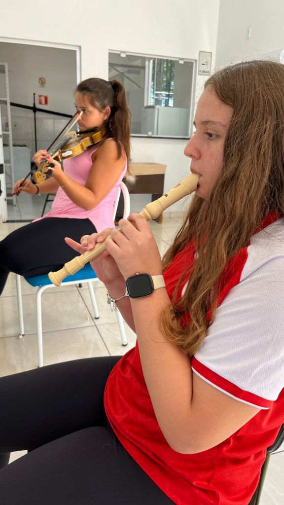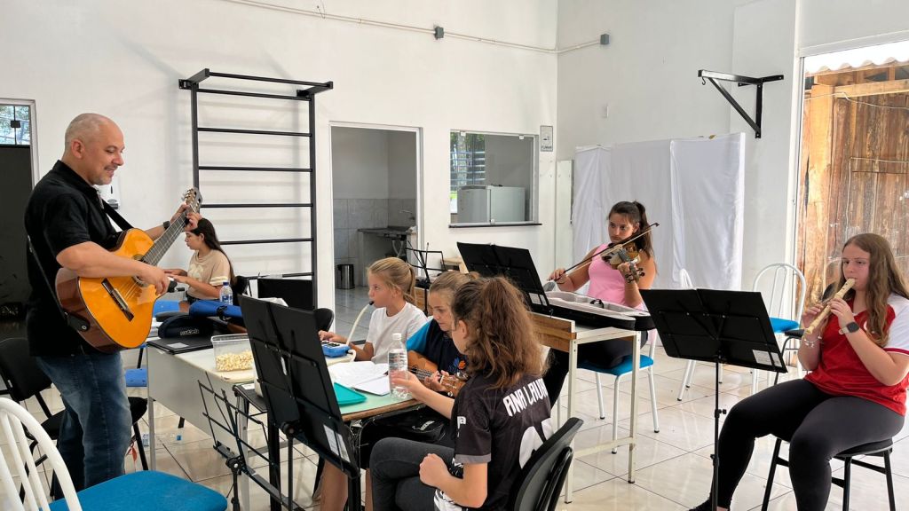O projeto oferece aulas de violino, violão, escaleta, flauta, bateria, teclado, saxofone, contemplando uma variedade de instrumentos que permitem aos alunos explorar diferentes sons e estilos musicais.