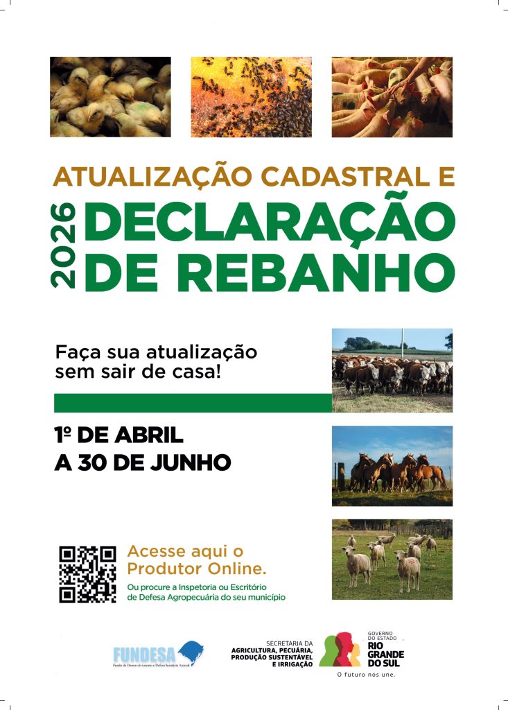 Os produtores rurais do Rio Grande do Sul deverão realizar, entre os dias 1º de abril e 30 de junho de 2026, a atualização cadastral e a declaração anual de rebanho referente ao ano de 2026. A medida é obrigatória e faz parte das ações de controle sanitário e acompanhamento da produção pecuária no estado.