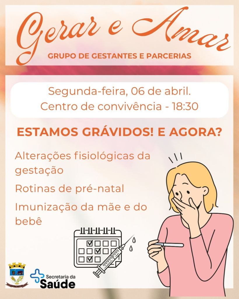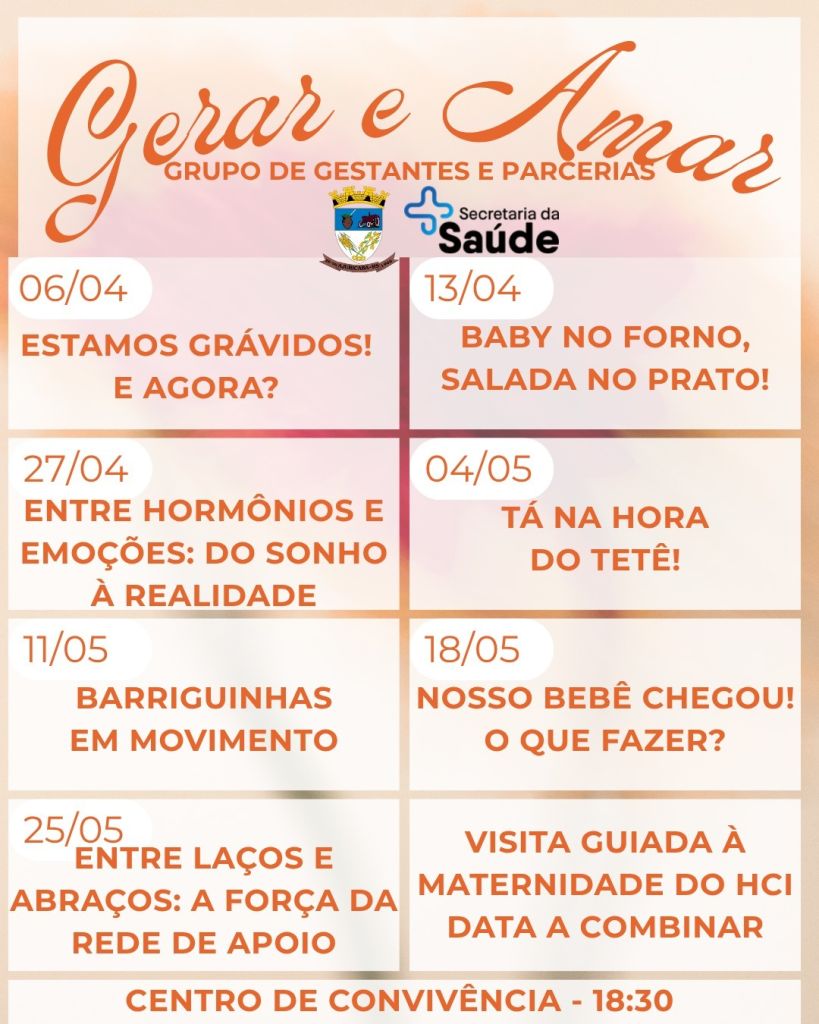 A Secretaria Municipal de Saúde dará início, na próxima semana, ao Grupo de Gestantes e Parceiras “Gerar e Amar”, uma iniciativa voltada ao acolhimento, orientação e troca de experiências entre gestantes e seus parceiros. O primeiro encontro acontece no dia 6 de abril, marcando o início de uma programação especial que se estende ao longo dos meses de abril e maio.