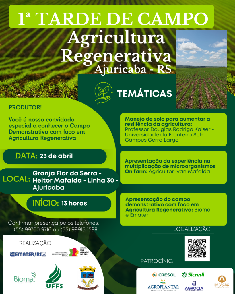 A Emater/RS-Ascar, em parceria com a Secretaria Municipal de Agricultura, Universidade Federal da Fronteira Sul (UFFS), Governo do Estado e Bioma, promove no próximo dia 23 de abril a 1ª Tarde de Campo sobre Agricultura Regenerativa.